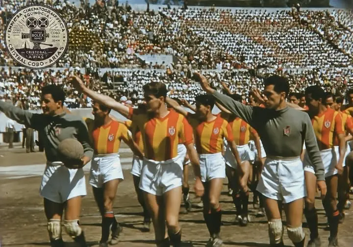 Desfile de las escuadras participantes en el cuadrangular organizado con motivo de la inauguración del Estadio Olímpico Municipal del Batán. En la gráfica Boca Juniors de Cali. Foto © Archivo Empresa Cinematográfica Equinoccial.