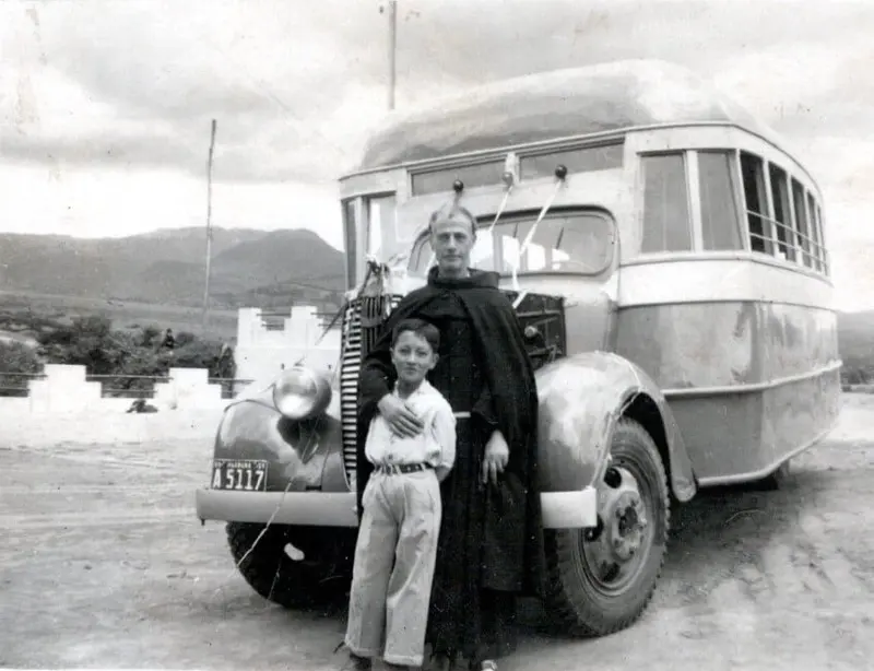 Rvdo. N. Castilla y el niño Rodrigo Núñez, junto al primer bus adquirido Foto © Archivo personal Jaime Núñez G.