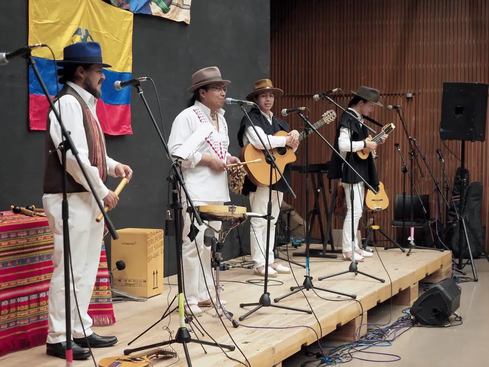 Grupo Los Kichwas. Jaime Gramal está con ropa blanca en el centro.