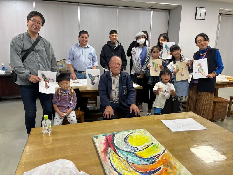 La exposición del maestro José Bastidas en la Galería Takanawa en Tokio se realizó desde el 5 hasta el 12 de octubre. El día 11 estuvo programado el taller de pintura con los niños japoneses al cual asistí. El maestro explicó brevemente el objetivo y luego distribuyó el material a todos los asistentes para que den color a la plantilla. Los resultados fueron variados como se puede apreciar en las fotos. Al final, el cuadro que el maestro produjo como ejemplo fue sorteado entre los asistentes.