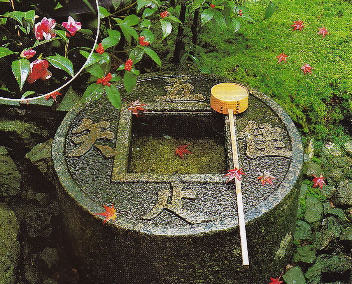1. TSUBUKAI, es un lavabo redondo que tiene la forma de una antigua moneda japonesa, con cuatro caracteres grabados en los lados que, individualmente, carecen de significado. Sin embargo, al unirlos con el cuadrado central (que corresponde a la forma del carácter japonés que significa “boca”), el significado de los cuatro caracteres se transforma, dando lugar a la siguiente lectura: